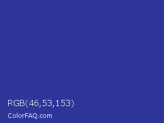 RGB 46,53,153 Color is a normal blue color and the nearest color is Blue Pigment #333399. Hex code #2e3599 and RGB value is rgb(46,53,153). In RGB color space, this color is composed of 18% red, 21% green, 60% blue, In CMYK color space, this color is composed of 70% cyan, 65% magenta, 0% yellow , 40% black , In HSL color space, this color has a hue angle of 236° , 54% saturation and 39% lightness.