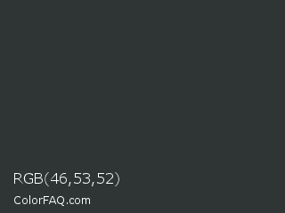 RGB 46,53,52 Color is a very dark cyan color and the nearest color is Mine Shaft #323232. Hex code #2e3534 and RGB value is rgb(46,53,52). In RGB color space, this color is composed of 18% red, 21% green, 20% blue, In CMYK color space, this color is composed of 13% cyan, 0% magenta, 2% yellow , 79% black , In HSL color space, this color has a hue angle of 171° , 7% saturation and 19% lightness.