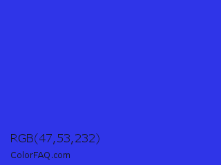 RGB 47,53,232 Color is a normal blue color and the nearest color is Palatinate Blue #273be2. Hex code #2f35e8 and RGB value is rgb(47,53,232). In RGB color space, this color is composed of 18% red, 21% green, 91% blue, In CMYK color space, this color is composed of 80% cyan, 77% magenta, 0% yellow , 9% black , In HSL color space, this color has a hue angle of 238° , 80% saturation and 55% lightness.