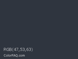 RGB 47,53,63 Color is a very dark blue color and the nearest color is Outer Space Crayola #2d383a. Hex code #2f353f and RGB value is rgb(47,53,63). In RGB color space, this color is composed of 18% red, 21% green, 25% blue, In CMYK color space, this color is composed of 25% cyan, 16% magenta, 0% yellow , 75% black , In HSL color space, this color has a hue angle of 218° , 15% saturation and 22% lightness.