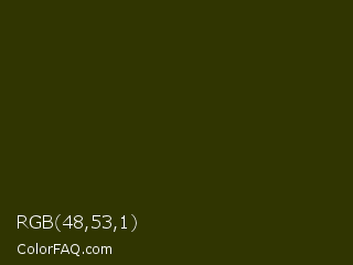 RGB 48,53,1 Color is a very dark yellow color and the nearest color is Turtle Green #2a380b. Hex code #303501 and RGB value is rgb(48,53,1). In RGB color space, this color is composed of 19% red, 21% green, 0% blue, In CMYK color space, this color is composed of 9% cyan, 0% magenta, 98% yellow , 79% black , In HSL color space, this color has a hue angle of 66° , 96% saturation and 11% lightness.