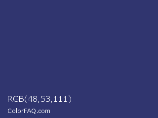 RGB 48,53,111 Color is a normal blue color and the nearest color is Deep Koamaru #333366. Hex code #30356f and RGB value is rgb(48,53,111). In RGB color space, this color is composed of 19% red, 21% green, 44% blue, In CMYK color space, this color is composed of 57% cyan, 52% magenta, 0% yellow , 56% black , In HSL color space, this color has a hue angle of 235° , 40% saturation and 31% lightness.