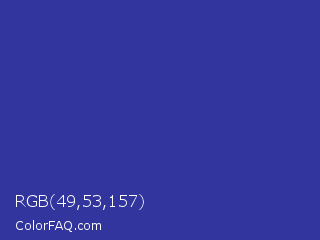 RGB 49,53,157 Color is a normal blue color and the nearest color is Blue Pigment #333399. Hex code #31359d and RGB value is rgb(49,53,157). In RGB color space, this color is composed of 19% red, 21% green, 62% blue, In CMYK color space, this color is composed of 69% cyan, 66% magenta, 0% yellow , 38% black , In HSL color space, this color has a hue angle of 238° , 52% saturation and 40% lightness.