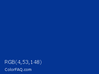 RGB 4,53,148 Color is a dark blue color and the nearest color is Smalt #003399. Hex code #043594 and RGB value is rgb(4,53,148). In RGB color space, this color is composed of 2% red, 21% green, 58% blue, In CMYK color space, this color is composed of 97% cyan, 64% magenta, 0% yellow , 42% black , In HSL color space, this color has a hue angle of 220° , 95% saturation and 30% lightness.