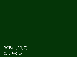 RGB 4,53,7 Color is a very dark green color and the nearest color is Deep Fir #002900. Hex code #043507 and RGB value is rgb(4,53,7). In RGB color space, this color is composed of 2% red, 21% green, 3% blue, In CMYK color space, this color is composed of 92% cyan, 0% magenta, 87% yellow , 79% black , In HSL color space, this color has a hue angle of 124° , 86% saturation and 11% lightness.