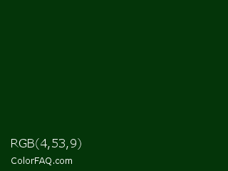RGB 4,53,9 Color is a very dark green color and the nearest color is English Holly #022d15. Hex code #043509 and RGB value is rgb(4,53,9). In RGB color space, this color is composed of 2% red, 21% green, 4% blue, In CMYK color space, this color is composed of 92% cyan, 0% magenta, 83% yellow , 79% black , In HSL color space, this color has a hue angle of 126° , 86% saturation and 11% lightness.