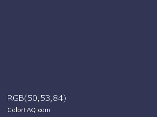 RGB 50,53,84 Color is a dark blue color and the nearest color is Martinique #363050. Hex code #323554 and RGB value is rgb(50,53,84). In RGB color space, this color is composed of 20% red, 21% green, 33% blue, In CMYK color space, this color is composed of 40% cyan, 37% magenta, 0% yellow , 67% black , In HSL color space, this color has a hue angle of 235° , 25% saturation and 26% lightness.