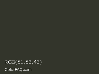 RGB 51,53,43 Color is a very dark lime color and the nearest color is Mine Shaft #323232. Hex code #33352b and RGB value is rgb(51,53,43). In RGB color space, this color is composed of 20% red, 21% green, 17% blue, In CMYK color space, this color is composed of 4% cyan, 0% magenta, 19% yellow , 79% black , In HSL color space, this color has a hue angle of 72° , 10% saturation and 19% lightness.