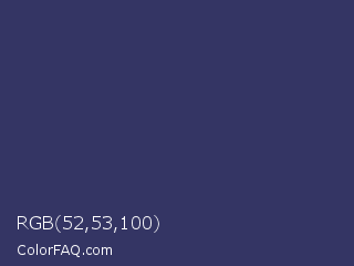 RGB 52,53,100 Color is a dark blue color and the nearest color is Deep Koamaru #333366. Hex code #343564 and RGB value is rgb(52,53,100). In RGB color space, this color is composed of 20% red, 21% green, 39% blue, In CMYK color space, this color is composed of 48% cyan, 47% magenta, 0% yellow , 61% black , In HSL color space, this color has a hue angle of 239° , 32% saturation and 30% lightness.