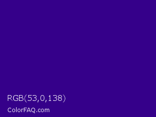 RGB 53,0,138 Color is a dark violet color and the nearest color is Kingfisher Daisy #3e0480. Hex code #35008a and RGB value is rgb(53,0,138). In RGB color space, this color is composed of 21% red, 0% green, 54% blue, In CMYK color space, this color is composed of 62% cyan, 100% magenta, 0% yellow , 46% black , In HSL color space, this color has a hue angle of 263° , 100% saturation and 27% lightness.