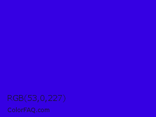 RGB 53,0,227 Color is a normal indigo color and the nearest color is Interdimensional Blue #360ccc. Hex code #3500e3 and RGB value is rgb(53,0,227). In RGB color space, this color is composed of 21% red, 0% green, 89% blue, In CMYK color space, this color is composed of 77% cyan, 100% magenta, 0% yellow , 11% black , In HSL color space, this color has a hue angle of 254° , 100% saturation and 45% lightness.