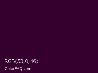 RGB 53,0,46 Color is a very dark magenta color and the nearest color is Mardi Gras #350036. Hex code #35002e and RGB value is rgb(53,0,46). In RGB color space, this color is composed of 21% red, 0% green, 18% blue, In CMYK color space, this color is composed of 0% cyan, 100% magenta, 13% yellow , 79% black , In HSL color space, this color has a hue angle of 308° , 100% saturation and 10% lightness.