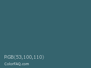 RGB 53,100,110 Color is a normal cyan color and the nearest color is William #3a686c. Hex code #35646e and RGB value is rgb(53,100,110). In RGB color space, this color is composed of 21% red, 39% green, 43% blue, In CMYK color space, this color is composed of 52% cyan, 9% magenta, 0% yellow , 57% black , In HSL color space, this color has a hue angle of 191° , 35% saturation and 32% lightness.