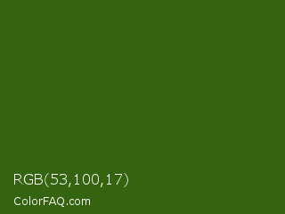RGB 53,100,17 Color is a dark green color and the nearest color is Dell #396413. Hex code #356411 and RGB value is rgb(53,100,17). In RGB color space, this color is composed of 21% red, 39% green, 7% blue, In CMYK color space, this color is composed of 47% cyan, 0% magenta, 83% yellow , 61% black , In HSL color space, this color has a hue angle of 94° , 71% saturation and 23% lightness.