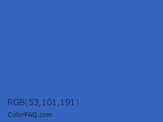 RGB 53,101,191 Color is a normal blue color and the nearest color is Mariner #286acd. Hex code #3565bf and RGB value is rgb(53,101,191). In RGB color space, this color is composed of 21% red, 40% green, 75% blue, In CMYK color space, this color is composed of 72% cyan, 47% magenta, 0% yellow , 25% black , In HSL color space, this color has a hue angle of 219° , 57% saturation and 48% lightness.