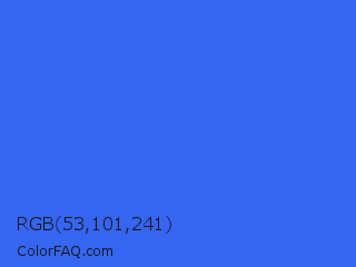 RGB 53,101,241 Color is a normal blue color and the nearest color is Ultramarine Blue #4166f5. Hex code #3565f1 and RGB value is rgb(53,101,241). In RGB color space, this color is composed of 21% red, 40% green, 95% blue, In CMYK color space, this color is composed of 78% cyan, 58% magenta, 0% yellow , 5% black , In HSL color space, this color has a hue angle of 225° , 87% saturation and 58% lightness.