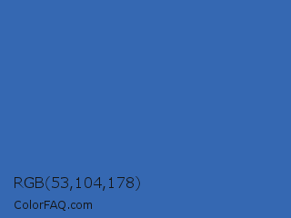 RGB 53,104,178 Color is a normal blue color and the nearest color is San Marino #456cac. Hex code #3568b2 and RGB value is rgb(53,104,178). In RGB color space, this color is composed of 21% red, 41% green, 70% blue, In CMYK color space, this color is composed of 70% cyan, 42% magenta, 0% yellow , 30% black , In HSL color space, this color has a hue angle of 216° , 54% saturation and 45% lightness.