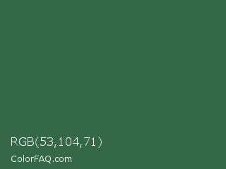 RGB 53,104,71 Color is a normal green color and the nearest color is Killarney #3a6a47. Hex code #356847 and RGB value is rgb(53,104,71). In RGB color space, this color is composed of 21% red, 41% green, 28% blue, In CMYK color space, this color is composed of 49% cyan, 0% magenta, 32% yellow , 59% black , In HSL color space, this color has a hue angle of 141° , 32% saturation and 31% lightness.