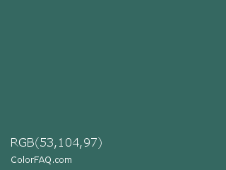 RGB 53,104,97 Color is a normal cyan color and the nearest color is Casal #2f6168. Hex code #356861 and RGB value is rgb(53,104,97). In RGB color space, this color is composed of 21% red, 41% green, 38% blue, In CMYK color space, this color is composed of 49% cyan, 0% magenta, 7% yellow , 59% black , In HSL color space, this color has a hue angle of 172° , 32% saturation and 31% lightness.