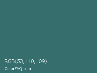 RGB 53,110,109 Color is a normal cyan color and the nearest color is William #3a686c. Hex code #356e6d and RGB value is rgb(53,110,109). In RGB color space, this color is composed of 21% red, 43% green, 43% blue, In CMYK color space, this color is composed of 52% cyan, 0% magenta, 1% yellow , 57% black , In HSL color space, this color has a hue angle of 179° , 35% saturation and 32% lightness.