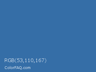 RGB 53,110,167 Color is a normal blue color and the nearest color is Astral #327da0. Hex code #356ea7 and RGB value is rgb(53,110,167). In RGB color space, this color is composed of 21% red, 43% green, 65% blue, In CMYK color space, this color is composed of 68% cyan, 34% magenta, 0% yellow , 35% black , In HSL color space, this color has a hue angle of 210° , 52% saturation and 43% lightness.