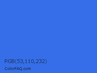 RGB 53,110,232 Color is a normal blue color and the nearest color is Royal Blue #4169e1. Hex code #356ee8 and RGB value is rgb(53,110,232). In RGB color space, this color is composed of 21% red, 43% green, 91% blue, In CMYK color space, this color is composed of 77% cyan, 53% magenta, 0% yellow , 9% black , In HSL color space, this color has a hue angle of 221° , 80% saturation and 56% lightness.