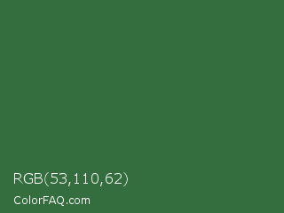 RGB 53,110,62 Color is a normal green color and the nearest color is Killarney #3a6a47. Hex code #356e3e and RGB value is rgb(53,110,62). In RGB color space, this color is composed of 21% red, 43% green, 24% blue, In CMYK color space, this color is composed of 52% cyan, 0% magenta, 44% yellow , 57% black , In HSL color space, this color has a hue angle of 129° , 35% saturation and 32% lightness.