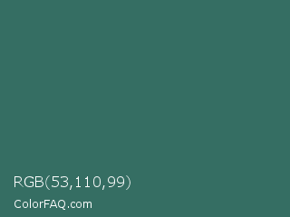 RGB 53,110,99 Color is a normal cyan color and the nearest color is William #3a686c. Hex code #356e63 and RGB value is rgb(53,110,99). In RGB color space, this color is composed of 21% red, 43% green, 39% blue, In CMYK color space, this color is composed of 52% cyan, 0% magenta, 10% yellow , 57% black , In HSL color space, this color has a hue angle of 168° , 35% saturation and 32% lightness.