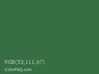 RGB 53,111,67 Color is a normal green color and the nearest color is Killarney #3a6a47. Hex code #356f43 and RGB value is rgb(53,111,67). In RGB color space, this color is composed of 21% red, 44% green, 26% blue, In CMYK color space, this color is composed of 52% cyan, 0% magenta, 40% yellow , 56% black , In HSL color space, this color has a hue angle of 134° , 35% saturation and 32% lightness.