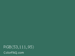 RGB 53,111,95 Color is a normal green color and the nearest color is Amazon #3b7a57. Hex code #356f5f and RGB value is rgb(53,111,95). In RGB color space, this color is composed of 21% red, 44% green, 37% blue, In CMYK color space, this color is composed of 52% cyan, 0% magenta, 14% yellow , 56% black , In HSL color space, this color has a hue angle of 163° , 35% saturation and 32% lightness.
