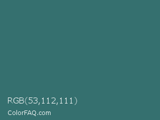 RGB 53,112,111 Color is a normal cyan color and the nearest color is Oracle #377475. Hex code #35706f and RGB value is rgb(53,112,111). In RGB color space, this color is composed of 21% red, 44% green, 44% blue, In CMYK color space, this color is composed of 53% cyan, 0% magenta, 1% yellow , 56% black , In HSL color space, this color has a hue angle of 179° , 36% saturation and 32% lightness.