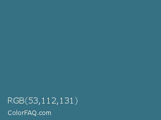 RGB 53,112,131 Color is a normal blue color and the nearest color is Teal Blue #367588. Hex code #357083 and RGB value is rgb(53,112,131). In RGB color space, this color is composed of 21% red, 44% green, 51% blue, In CMYK color space, this color is composed of 60% cyan, 15% magenta, 0% yellow , 49% black , In HSL color space, this color has a hue angle of 195° , 42% saturation and 36% lightness.