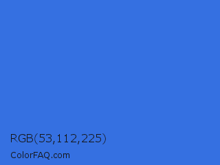 RGB 53,112,225 Color is a normal blue color and the nearest color is Royal Blue #4169e1. Hex code #3570e1 and RGB value is rgb(53,112,225). In RGB color space, this color is composed of 21% red, 44% green, 88% blue, In CMYK color space, this color is composed of 76% cyan, 50% magenta, 0% yellow , 12% black , In HSL color space, this color has a hue angle of 219° , 74% saturation and 55% lightness.