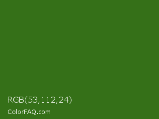 RGB 53,112,24 Color is a dark green color and the nearest color is Bilbao #327c14. Hex code #357018 and RGB value is rgb(53,112,24). In RGB color space, this color is composed of 21% red, 44% green, 9% blue, In CMYK color space, this color is composed of 53% cyan, 0% magenta, 79% yellow , 56% black , In HSL color space, this color has a hue angle of 100° , 65% saturation and 27% lightness.