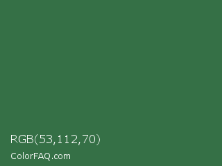 RGB 53,112,70 Color is a normal green color and the nearest color is Killarney #3a6a47. Hex code #357046 and RGB value is rgb(53,112,70). In RGB color space, this color is composed of 21% red, 44% green, 27% blue, In CMYK color space, this color is composed of 53% cyan, 0% magenta, 38% yellow , 56% black , In HSL color space, this color has a hue angle of 137° , 36% saturation and 32% lightness.