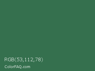 RGB 53,112,78 Color is a normal green color and the nearest color is Killarney #3a6a47. Hex code #35704e and RGB value is rgb(53,112,78). In RGB color space, this color is composed of 21% red, 44% green, 31% blue, In CMYK color space, this color is composed of 53% cyan, 0% magenta, 30% yellow , 56% black , In HSL color space, this color has a hue angle of 145° , 36% saturation and 32% lightness.