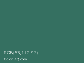 RGB 53,112,97 Color is a normal cyan color and the nearest color is William #3a686c. Hex code #357061 and RGB value is rgb(53,112,97). In RGB color space, this color is composed of 21% red, 44% green, 38% blue, In CMYK color space, this color is composed of 53% cyan, 0% magenta, 13% yellow , 56% black , In HSL color space, this color has a hue angle of 165° , 36% saturation and 32% lightness.
