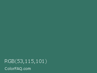 RGB 53,115,101 Color is a normal cyan color and the nearest color is William #3a686c. Hex code #357365 and RGB value is rgb(53,115,101). In RGB color space, this color is composed of 21% red, 45% green, 40% blue, In CMYK color space, this color is composed of 54% cyan, 0% magenta, 12% yellow , 55% black , In HSL color space, this color has a hue angle of 166° , 37% saturation and 33% lightness.