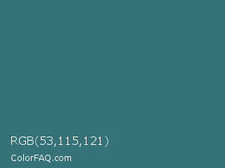 RGB 53,115,121 Color is a normal cyan color and the nearest color is Ming #36747d. Hex code #357379 and RGB value is rgb(53,115,121). In RGB color space, this color is composed of 21% red, 45% green, 47% blue, In CMYK color space, this color is composed of 56% cyan, 5% magenta, 0% yellow , 53% black , In HSL color space, this color has a hue angle of 185° , 39% saturation and 34% lightness.