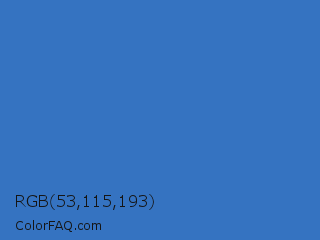 RGB 53,115,193 Color is a normal blue color and the nearest color is Mariner #286acd. Hex code #3573c1 and RGB value is rgb(53,115,193). In RGB color space, this color is composed of 21% red, 45% green, 76% blue, In CMYK color space, this color is composed of 73% cyan, 40% magenta, 0% yellow , 24% black , In HSL color space, this color has a hue angle of 213° , 57% saturation and 48% lightness.
