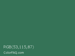 RGB 53,115,87 Color is a normal green color and the nearest color is Amazon #3b7a57. Hex code #357357 and RGB value is rgb(53,115,87). In RGB color space, this color is composed of 21% red, 45% green, 34% blue, In CMYK color space, this color is composed of 54% cyan, 0% magenta, 24% yellow , 55% black , In HSL color space, this color has a hue angle of 153° , 37% saturation and 33% lightness.