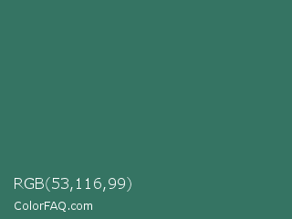 RGB 53,116,99 Color is a normal cyan color and the nearest color is Amazon #3b7a57. Hex code #357463 and RGB value is rgb(53,116,99). In RGB color space, this color is composed of 21% red, 45% green, 39% blue, In CMYK color space, this color is composed of 54% cyan, 0% magenta, 15% yellow , 55% black , In HSL color space, this color has a hue angle of 164° , 37% saturation and 33% lightness.