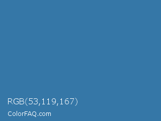 RGB 53,119,167 Color is a normal blue color and the nearest color is Astral #327da0. Hex code #3577a7 and RGB value is rgb(53,119,167). In RGB color space, this color is composed of 21% red, 47% green, 65% blue, In CMYK color space, this color is composed of 68% cyan, 29% magenta, 0% yellow , 35% black , In HSL color space, this color has a hue angle of 205° , 52% saturation and 43% lightness.