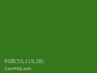 RGB 53,119,28 Color is a dark green color and the nearest color is Bilbao #327c14. Hex code #35771c and RGB value is rgb(53,119,28). In RGB color space, this color is composed of 21% red, 47% green, 11% blue, In CMYK color space, this color is composed of 55% cyan, 0% magenta, 76% yellow , 53% black , In HSL color space, this color has a hue angle of 104° , 62% saturation and 29% lightness.
