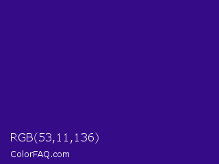 RGB 53,11,136 Color is a dark indigo color and the nearest color is Pixie Powder #391285. Hex code #350b88 and RGB value is rgb(53,11,136). In RGB color space, this color is composed of 21% red, 4% green, 53% blue, In CMYK color space, this color is composed of 61% cyan, 92% magenta, 0% yellow , 47% black , In HSL color space, this color has a hue angle of 260° , 85% saturation and 29% lightness.