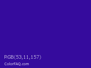 RGB 53,11,157 Color is a normal indigo color and the nearest color is Blue Gem #2c0e8c. Hex code #350b9d and RGB value is rgb(53,11,157). In RGB color space, this color is composed of 21% red, 4% green, 62% blue, In CMYK color space, this color is composed of 66% cyan, 93% magenta, 0% yellow , 38% black , In HSL color space, this color has a hue angle of 257° , 87% saturation and 33% lightness.