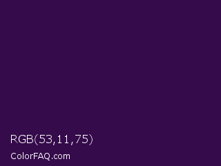 RGB 53,11,75 Color is a very dark purple color and the nearest color is Valentino #350e42. Hex code #350b4b and RGB value is rgb(53,11,75). In RGB color space, this color is composed of 21% red, 4% green, 29% blue, In CMYK color space, this color is composed of 29% cyan, 85% magenta, 0% yellow , 71% black , In HSL color space, this color has a hue angle of 279° , 74% saturation and 17% lightness.