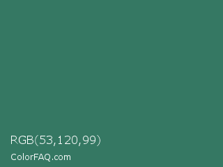 RGB 53,120,99 Color is a normal green color and the nearest color is Amazon #3b7a57. Hex code #357863 and RGB value is rgb(53,120,99). In RGB color space, this color is composed of 21% red, 47% green, 39% blue, In CMYK color space, this color is composed of 56% cyan, 0% magenta, 18% yellow , 53% black , In HSL color space, this color has a hue angle of 161° , 39% saturation and 34% lightness.
