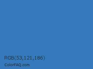 RGB 53,121,186 Color is a normal blue color and the nearest color is Cyan Blue Azure #4682bf. Hex code #3579ba and RGB value is rgb(53,121,186). In RGB color space, this color is composed of 21% red, 47% green, 73% blue, In CMYK color space, this color is composed of 72% cyan, 35% magenta, 0% yellow , 27% black , In HSL color space, this color has a hue angle of 209° , 56% saturation and 47% lightness.