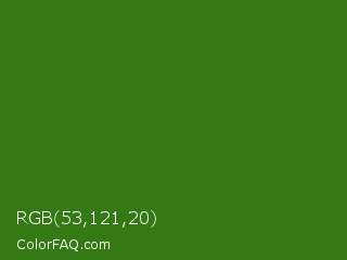 RGB 53,121,20 Color is a dark green color and the nearest color is Bilbao #327c14. Hex code #357914 and RGB value is rgb(53,121,20). In RGB color space, this color is composed of 21% red, 47% green, 8% blue, In CMYK color space, this color is composed of 56% cyan, 0% magenta, 83% yellow , 53% black , In HSL color space, this color has a hue angle of 100° , 72% saturation and 28% lightness.